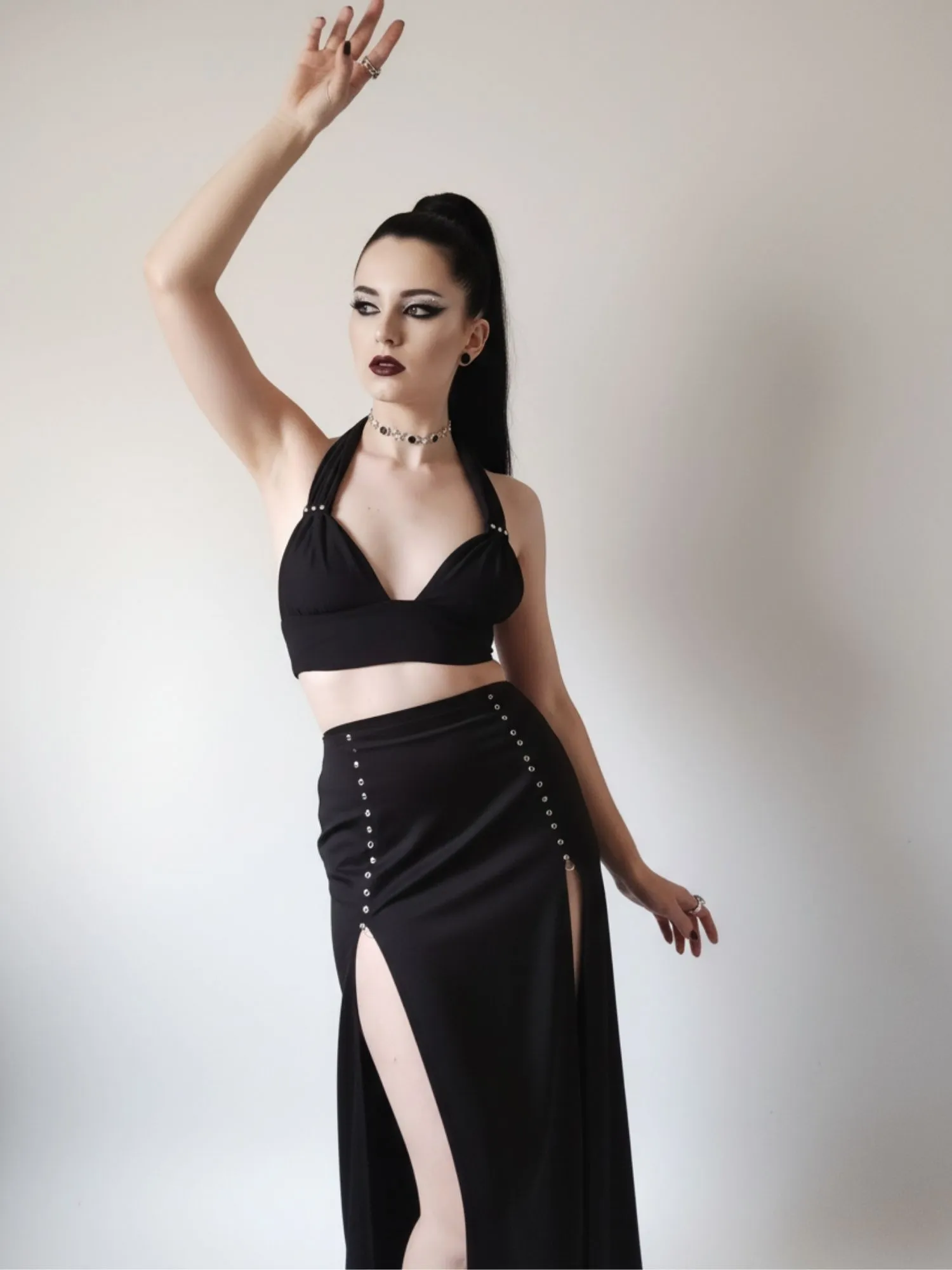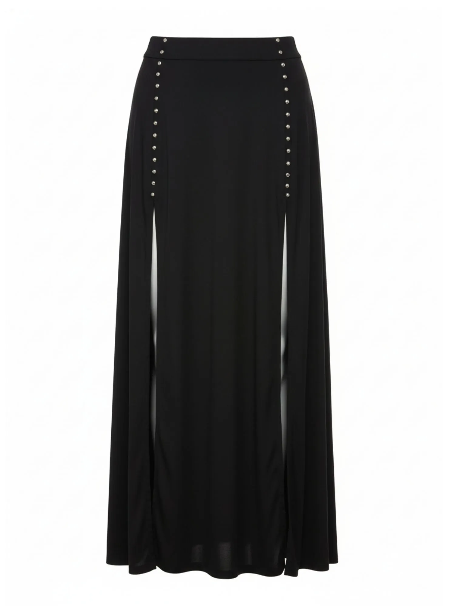 A saia longa com fenda é a peça chave para te deixar poderosa. As fendas laterais são adornadas com aplicações de rebites prateados, adicionando um toque de mistério e rebeldia, mantendo o look elegante e sensual. Combine com um cropped para um visual sexy ou com uma blusa mais fechada para um ar enigmático.